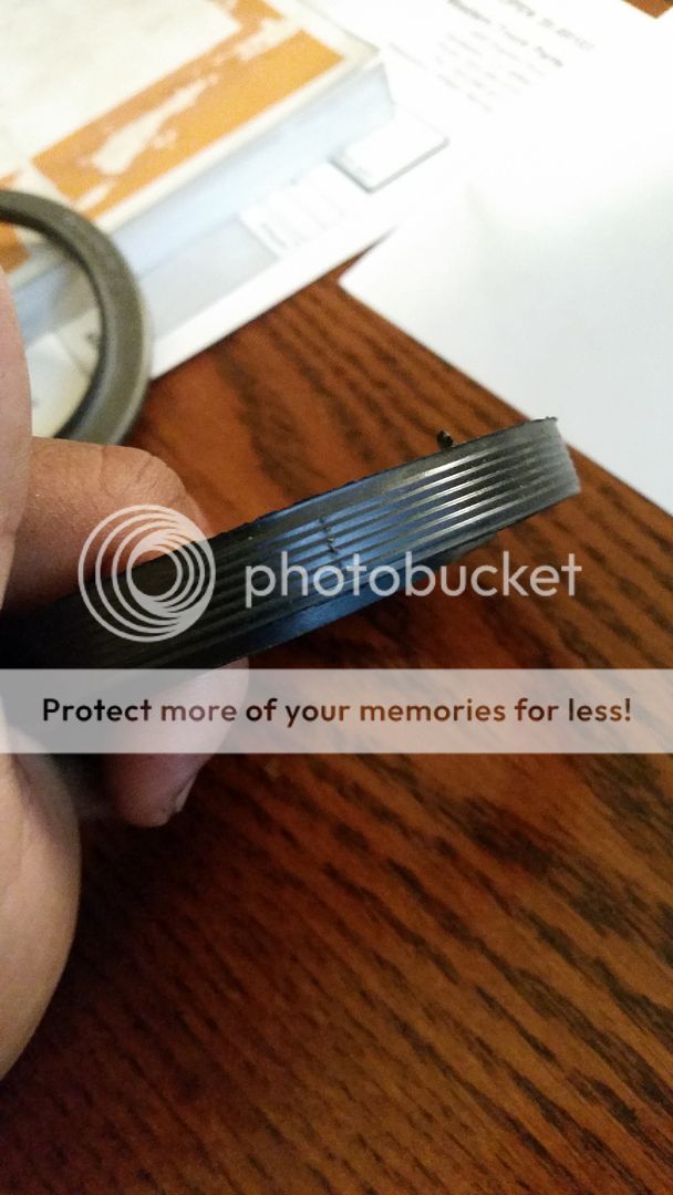 I knew the truck had and oil leak when I bought it so today I tore her apart and got to the front main looking at the seal which is definitely the culprit so I removed it and noticed that overall it looked pretty good other than one very small nick on the top of the seal. the aluminium front cover the seal goes into had some dings in it and cut his seal going in.. i guess, so i used some fine sand paper and cleaned up the dings really good, Ill be putting a dab of high tack around the outside diameter of the seal this time(this stuff is awesome if you dont use it you should, never hardens and is good for almost anything from threads to gaskets)